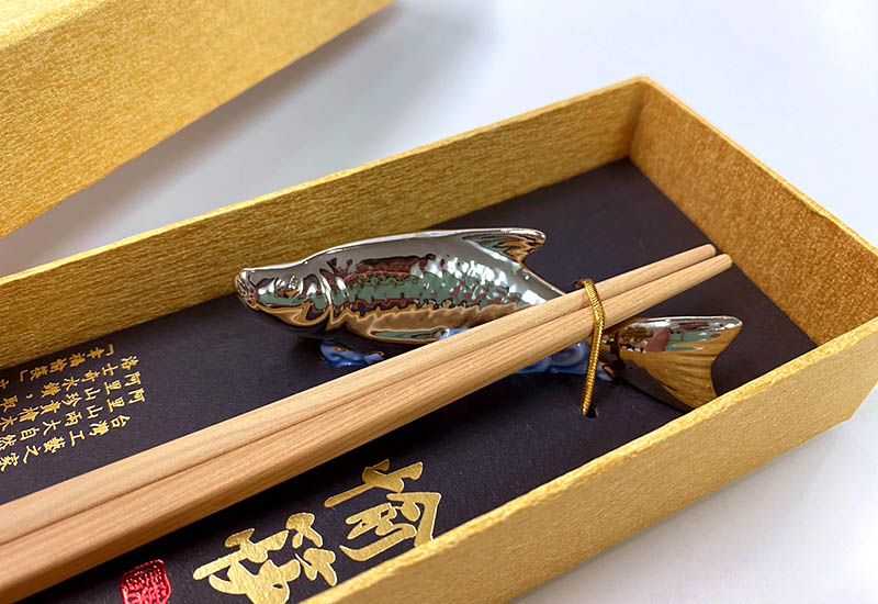以瓷器製成的總統魚作為筷架,結合阿里山珍貴檜木製筷子,取其諧音「愉筷」;