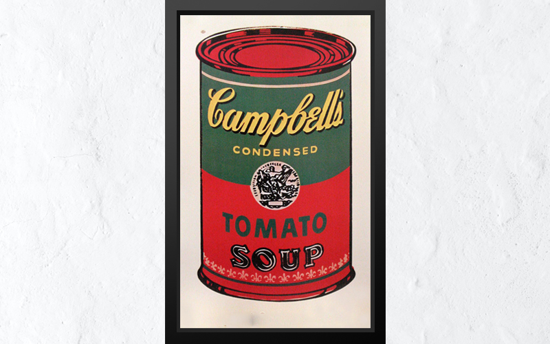 安迪·沃荷認為藝術與金錢掛勾,因此應該要努力把藝術商業化。他的著名作品中,有一幅不斷複製家傳戶曉的金寶湯圖案,就表現了資本主義生產方式的新一階段。他經常使用絹印版畫技法來重現圖像。他的作品中最常出現的是名人以及人們熟悉的事物,比如瑪麗蓮·夢露和埃爾維斯·普雷斯利。重複亦是其作品的一大特色。(來源:維基)