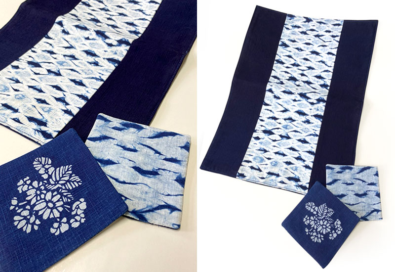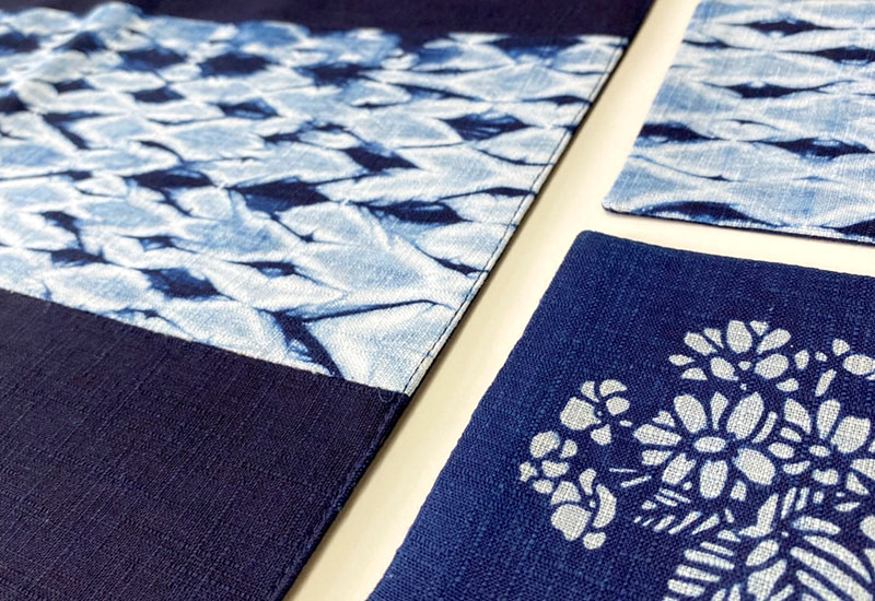 藍染水波紋結合藍染植物大菁圖案,讓餐桌上的擺飾有不同的風情