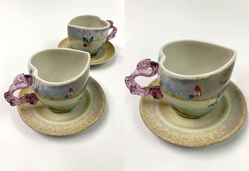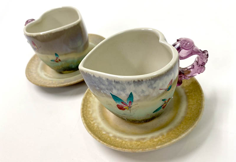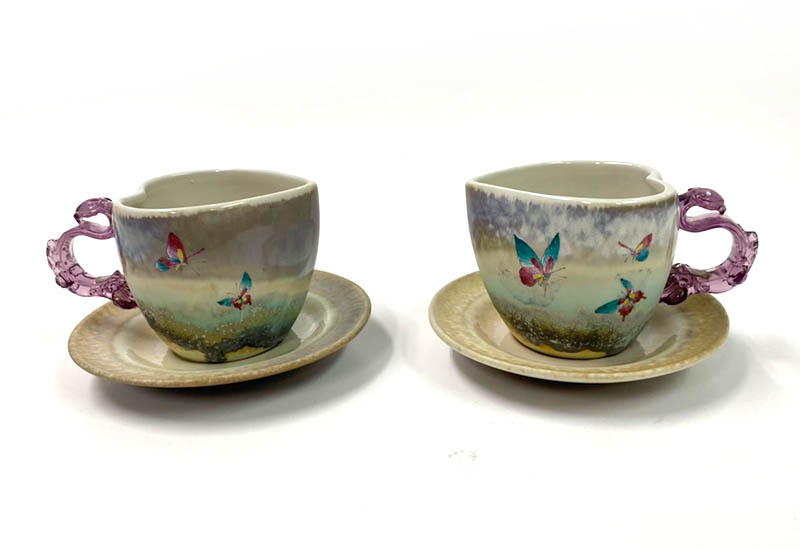 彩蝴蝶,展現出一欣欣向榮的生機。杯口設計成心的造型,與飛舞的彩蝶互相輝映著,充滿了浪漫的氣息。台灣是蝴蝶的故鄉,以蝴蝶創作,是否更令人感受到鄉土的親情