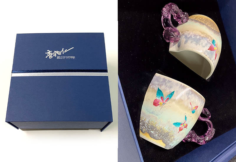 姿態優美的蝴蝶,飛翔遨遊在如同山水畫般筆墨淋漓的情境。心型蝴蝶對杯,經由多種溫層釉藥重疊施釉,高溫還原燒,呈現出多變釉色,媲美大自然的鬼斧神工,在不同溫度及窯位之下產生不同效果,有時是晴空萬里的廣闊草原,有時則是江南煙雨迷離朦朧。手工彩繪的粉彩蝴蝶,在靜態畫面中呈現動態美感。心形造型的杯口,別出心裁,與蝴蝶互相輝映,顯露浪漫氣息。