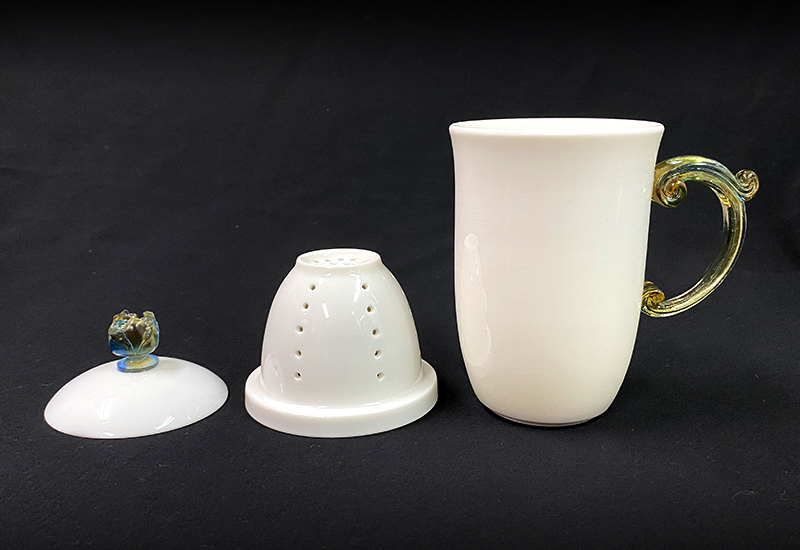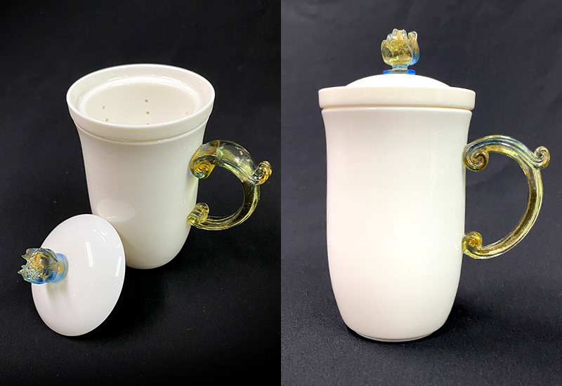 杯蓋蒂 頭與把手均有不同色彩及造型之搭配。高溫瓷燒,瓷質潔淨通透,在燈光照射下更能感覺到琉璃剔透及瓷質之美,敲打聲清脆,密度高。