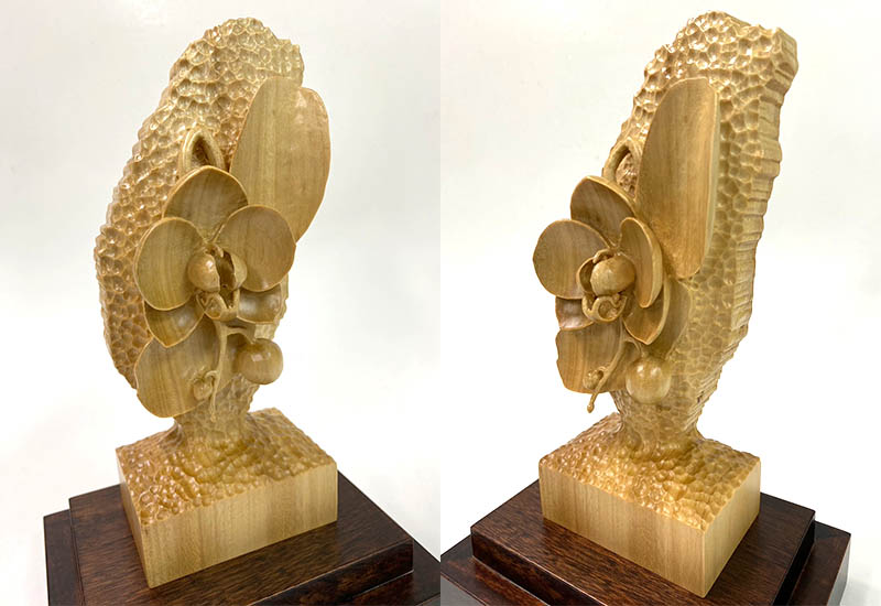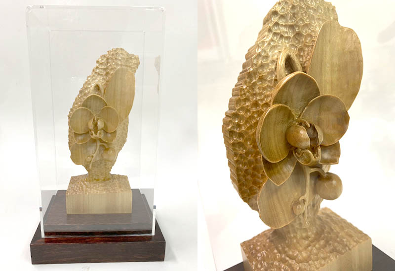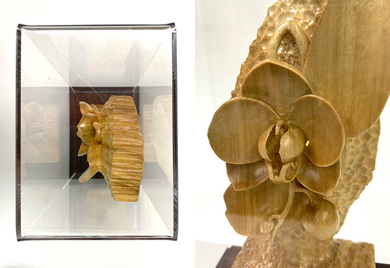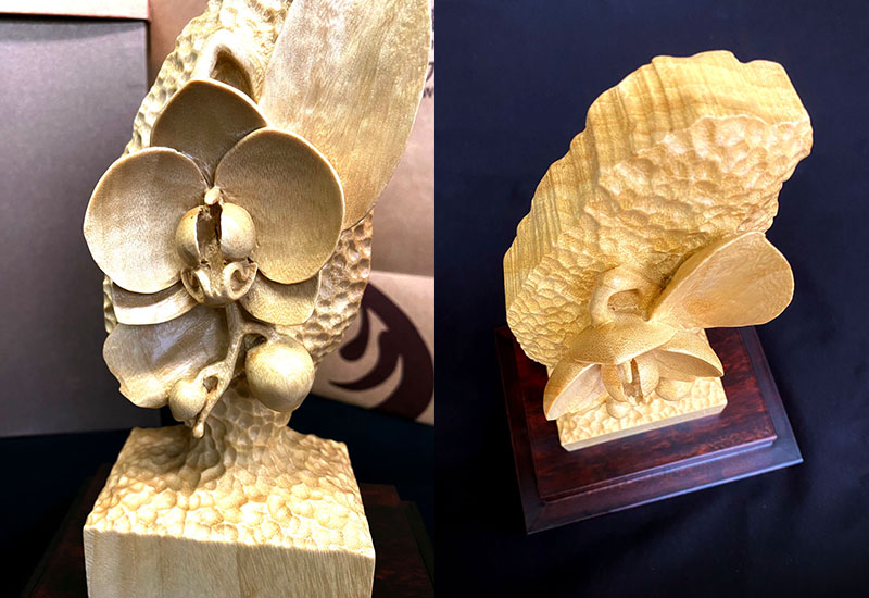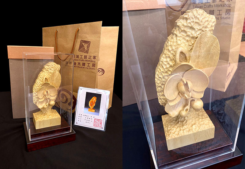 禮品以樟木材質搭配手工精雕台灣地形及蝴蝶蘭呈現的作品