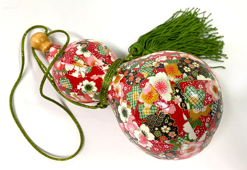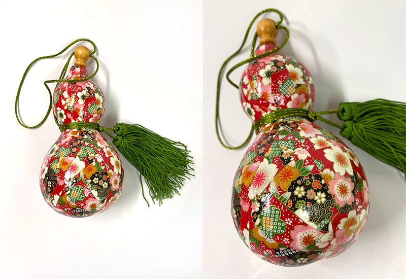 經由仔細拼貼日本和紙,多層上漆,費工費時所呈現極具和風的葫蘆作品,在配上結飾,成為精美裝飾品