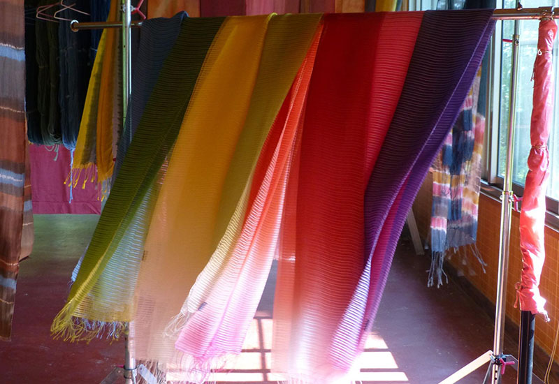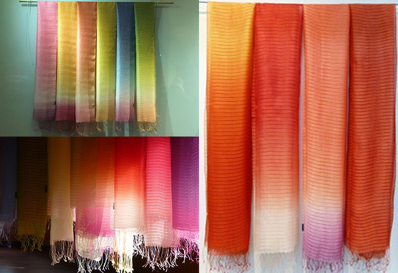 陳景林老師多年研究植物染工藝,主張尋找出台灣植物染色彩,鮮豔的植物染顏色搭配高級的纖維製作成美麗的披肩,由於手工染色的關係,每一條披肩都是如此的獨一無二,蠶絲擁有的特性,也讓披肩增添許多實質的功能。