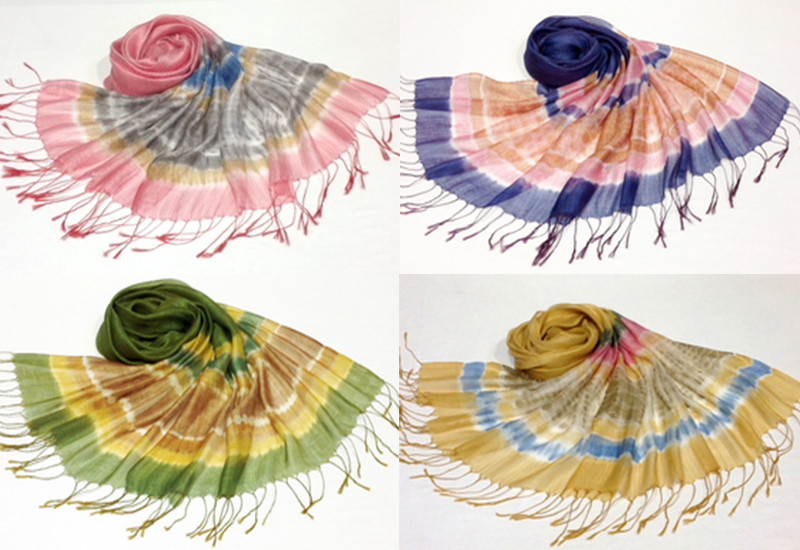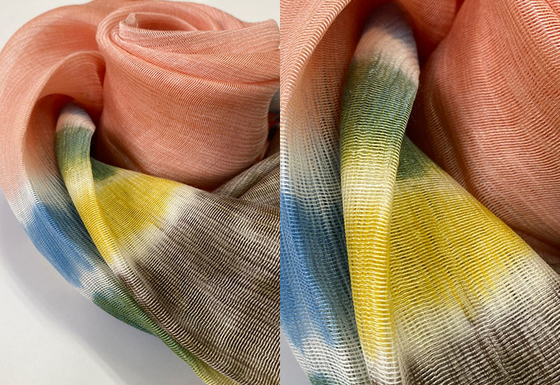 以100% 蠶絲為經線、100%棉為緯線,使用石榴皮、茜草、福木、七里香、胭脂蟲、墨水樹、藍靛等天然染料重複疊染而成。設計時重視配色效果,疊染時注重色彩演化,故能呈現極優雅的天然色質。採用分段綁染、多次複染的染色技藝,每染一種顏色即以綁紮技法防染,保留部分顏色,煮染欲染的顏色,如此經過數回拆綁與套染,才形成豐富的顏色變化。多次複染雖費工耗時,卻可呈現高妙的染纈創意,冀望手感柔軟的絲棉圍巾能將本工坊的天然染色研發力充分展現。