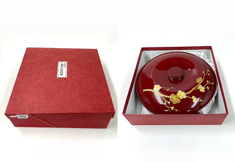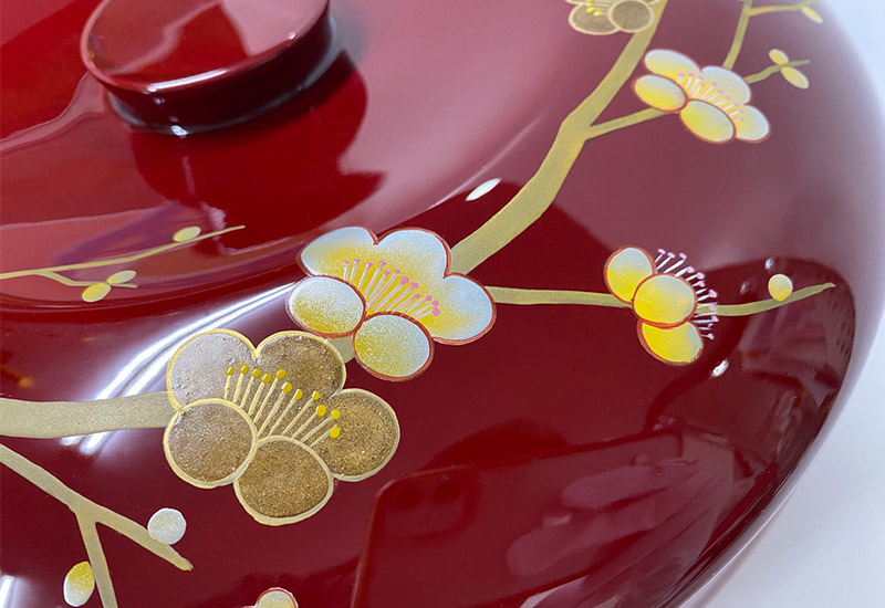 入選臺灣優良工藝品,利用蒔繪技法及多層塗漆,在大紅喜氣下享受立體梅花金色閃耀美感。