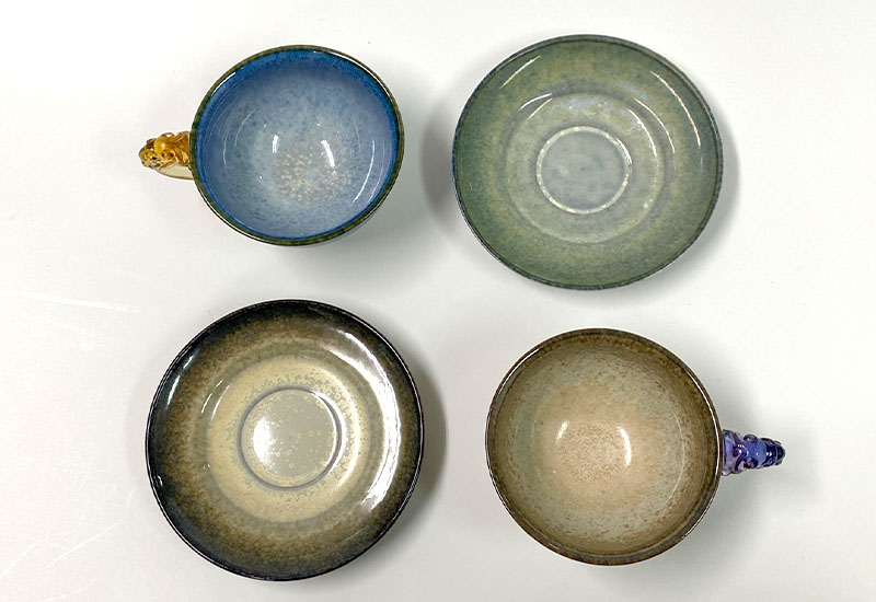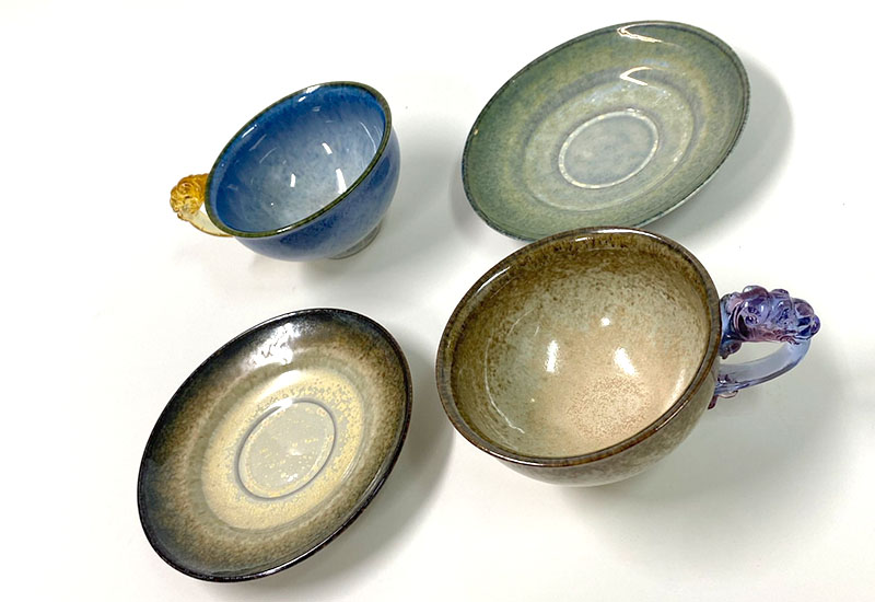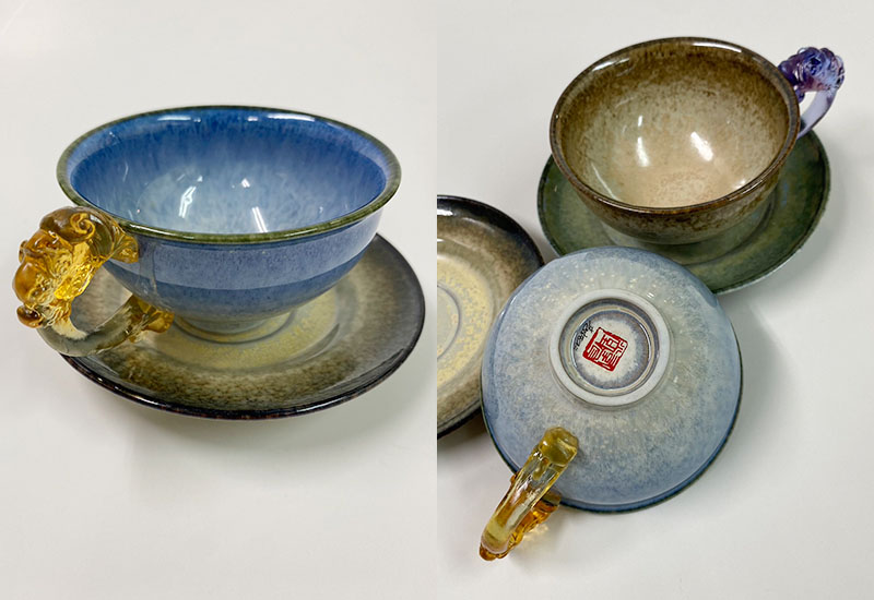 杯蓋蒂 頭與把手均有不同色彩及造型之搭配。高溫瓷燒,瓷質潔淨通透,在燈光照射下更能感覺到琉璃剔透及瓷質之美,敲打聲清脆,密度高。