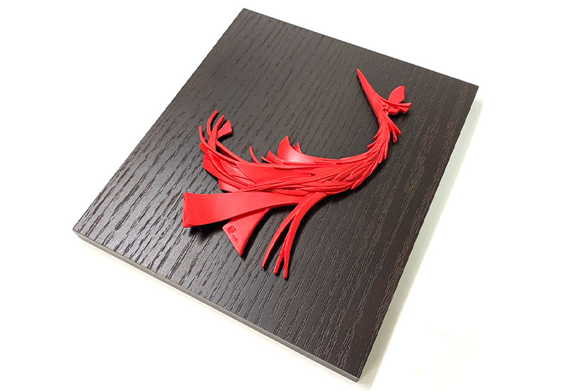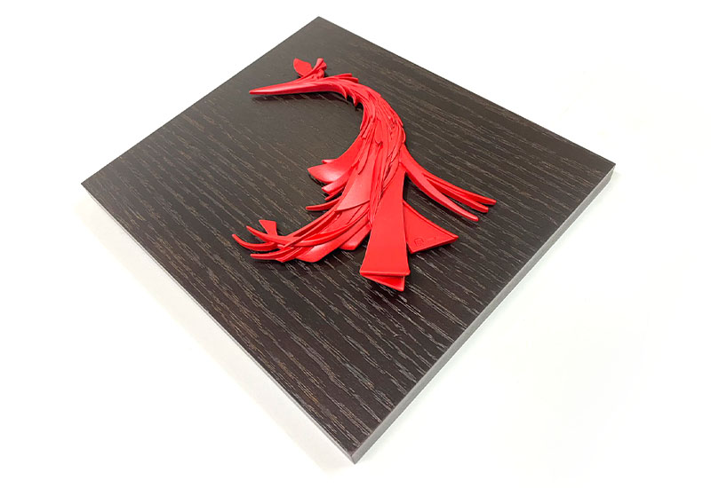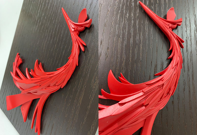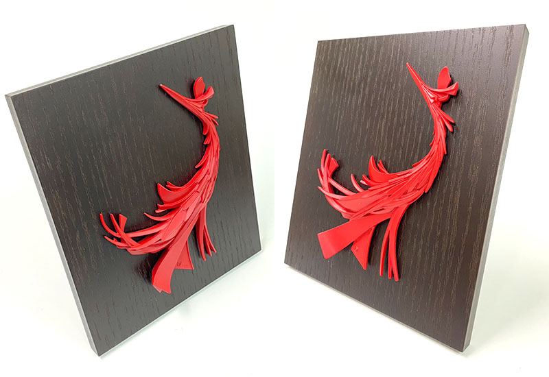 鳳凰,寓意吉祥、希望、幸福,以大紅色立體的鳳凰襯以木紋擺飾