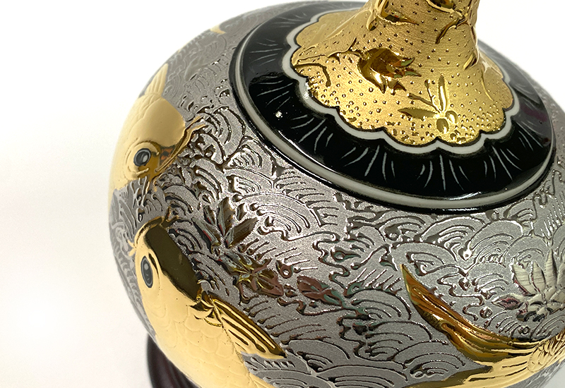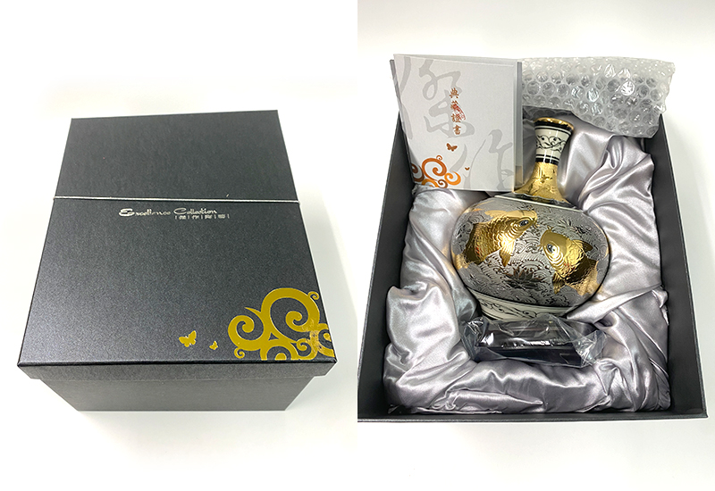 本作品為手拉胚成型,飾以各種中華吉祥紋飾。龍為地位象徵,牡丹為富貴之花,魚代表年年有餘,鶴與纏枝同為長壽及綿延不絕,蝴蝶則有幸福之意。且台灣為蝴蝶王國,極具本土文化意涵。