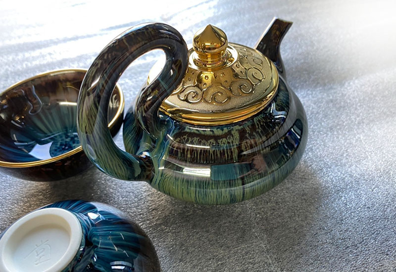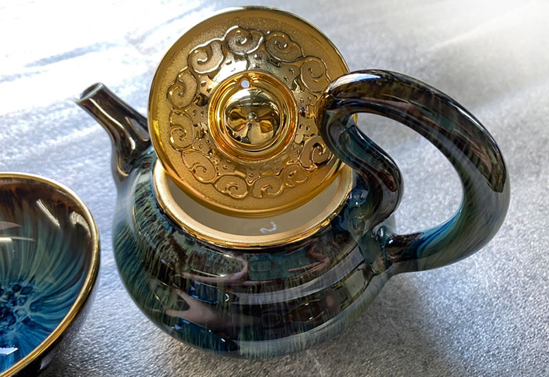 以黑天目釉為底釉,在用以鈷為主的面釉,採雙掛上釉的技法,搭配造型特殊的飛天把,其構造將壺蓋與茶壺本體相扣,造就斟茶時壺蓋不會掉落的玄機之處,壺蓋型取自乾隆的盔帽,暗喻自己的福祿壽財蒸蒸日上,成就泡茶的愉悅心情。