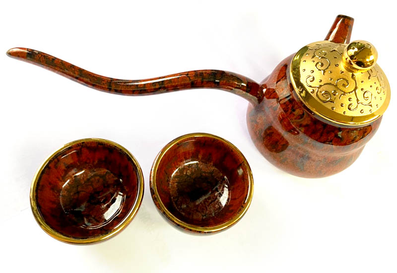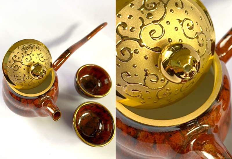 杯緣則是利用999真金,施以鎏金工藝燒製的一壺二杯,
