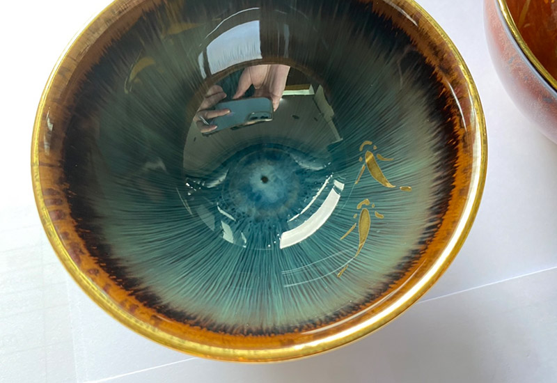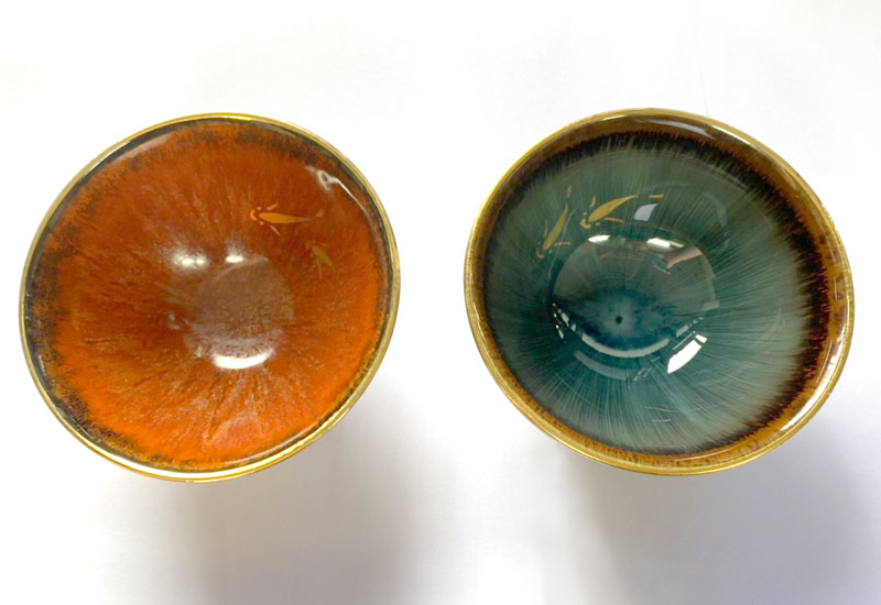 杯緣利用999真金,施以鎏金工藝燒製。杯內也是利用999真金,施以鎏金手繪曲線雙魚燒製,在茶湯內彷若真魚悠遊其中。