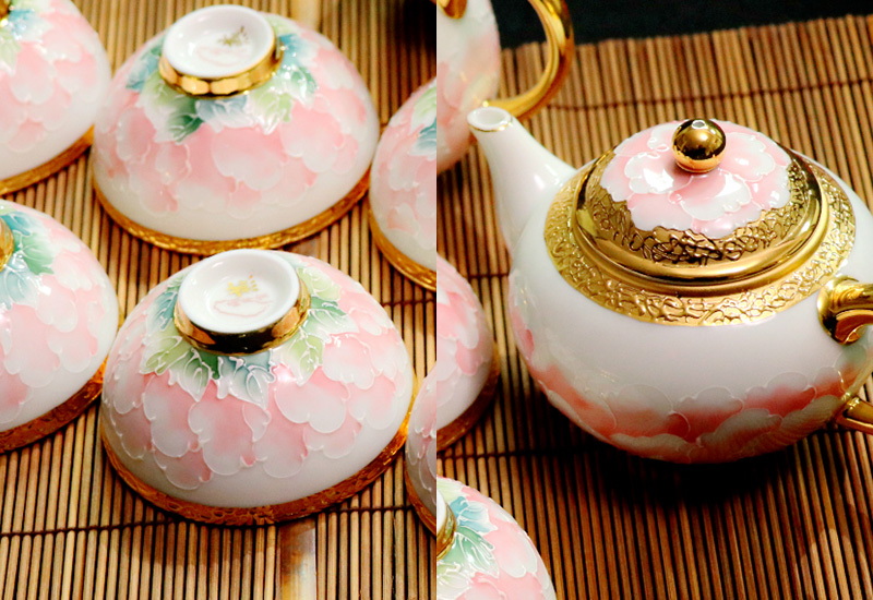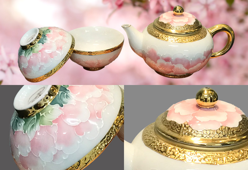 采用高溫釉下法華彩技術,純手工繪畫,加以99.99液態黃金鎏金,臺灣藝術愛好工作者張小燕突發構思設計。它把整個茶壼與茶杯當成一朵牡丹花造型,逼真地展現正在綻放中牡丹花的魅力。