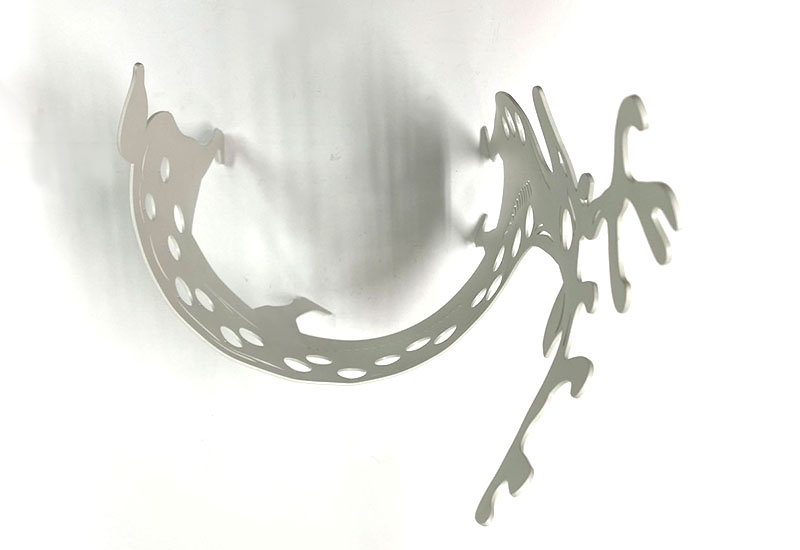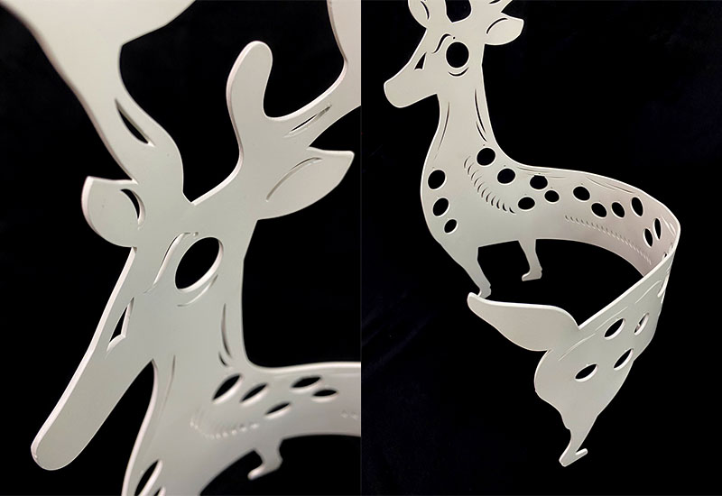 本系列以「動物」為表現主題,展現鋼鐵彎曲後的動態活力,其間依生態圖案鏤空的造形,懸掛風動之彩窗,彷彿與鋼鐵啟動一段美妙的圓舞曲,在空間展現360°面向皆不同的視覺魔幻風景。