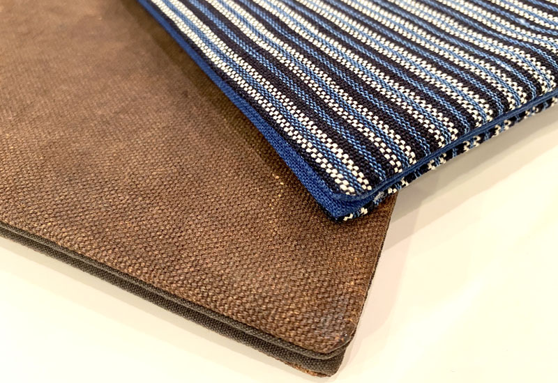 本產品的表布是以人工手織的厚棉布製作而成,它是植物染前染物,即在織作前先以藍靛染料將棉線染深,再搭配原色棉線交織成厚實的棉土布,織作縝密,素樸而耐用。