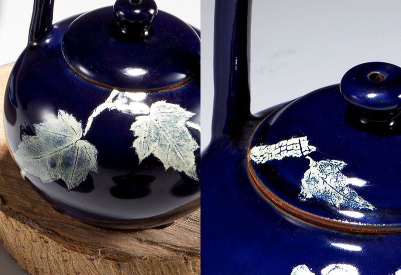 有著晶瑩剔透的美麗藍色,彷彿一顆藍寶石,裝飾一片真實樹葉在藍晶釉面的提樑壺裏,