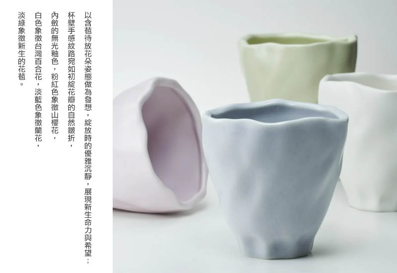 以含苞待放花朵姿態做為發想,綻放時的優雅沉靜,展現新生命力與希望;杯壁手感紋路宛如初綻花瓣的自然皺折,