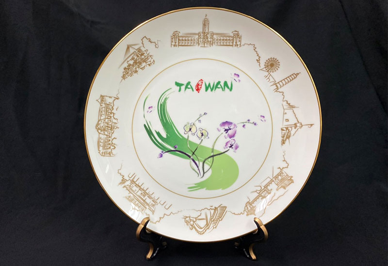 盤緣飾以八項台灣著名景點,中間則以蘭花為主構圖。