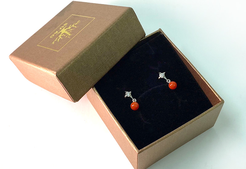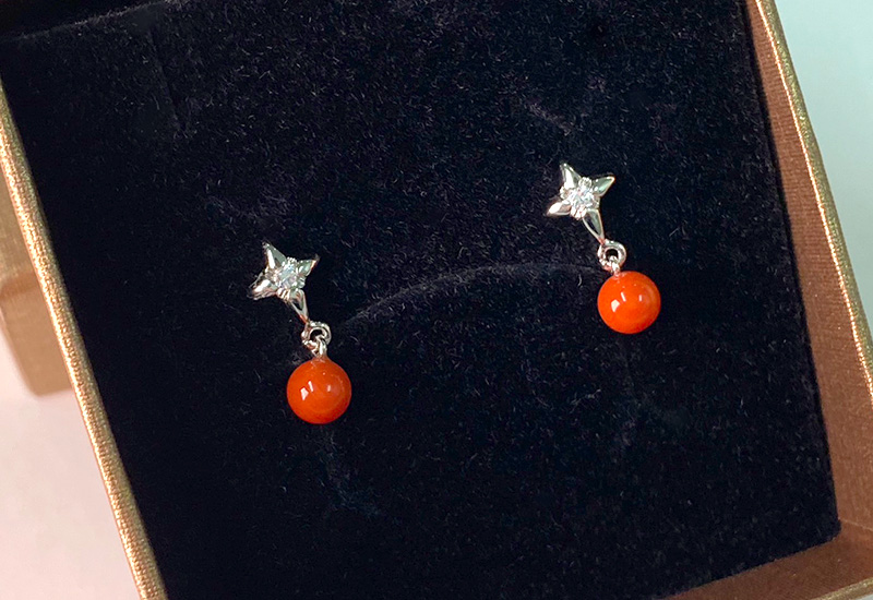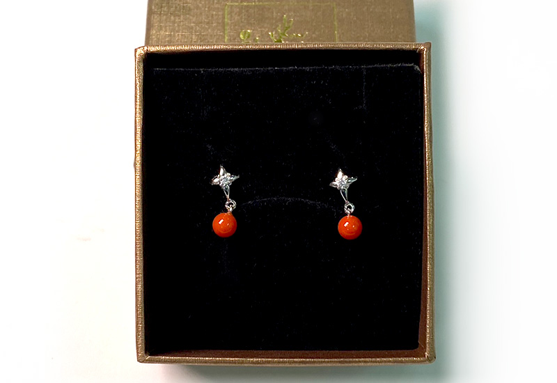 以垂墜的耳環樣式搭配圓珠珊瑚,優美小巧。是幸福、吉祥、圓滿、永恆的象徵。