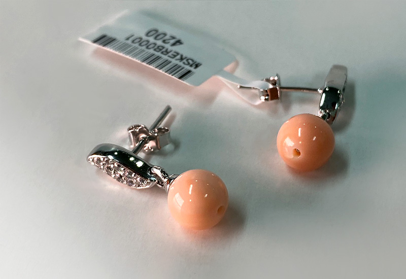 尺寸:0.7×0.7×1.5 cm、均0.9g 材質:珊瑚、銀鍍K台、水鑽