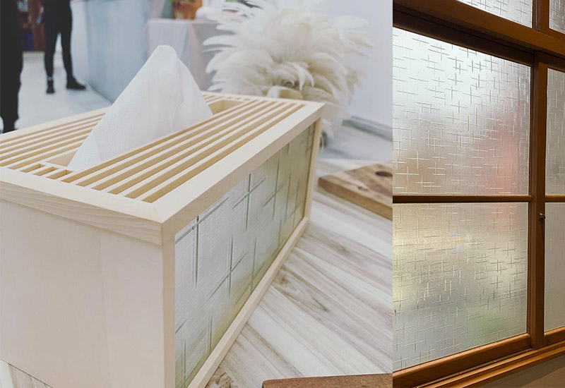 這次元素最特別的結合就是將木頭的花窗與玻璃的花窗融合為一體。玻璃我們採用的是明順玻璃行復古壓花玻璃來使用。這次的商品我們嚴選台製的十字紋