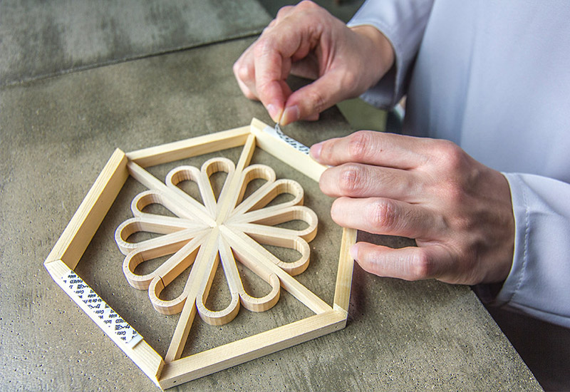 陳煌輝師傅,一甲子的花窗工藝,此工藝不用一釘一鉚,僅靠手工開鑿搭配傳統加工機具製作出榫接結構,將切削出來的組子拼出各種繁複精緻的花紋。日本稱為組子細工,台灣叫做花窗工藝。正利花窗工藝精湛,讓人嘖嘖稱奇。永茂木器早期都是大量製作室內建築材料,累積許多日式花窗技術。我們希望透過設計巧思讓這項技藝,不只是製作大體積的建材,而是可以縮小成為日常生活的生活用品。感謝師傅們的協助之下我們在今年推出了全新的花窗商品。