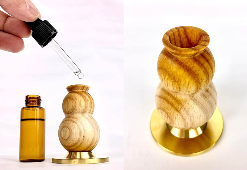 可以選擇自己愛用的擴香精油。直接滴入福蘆頂端得洞口。將精油吸收後透過物質敖細孔將香味釋放到空氣當中。 建議使用味道強烈的精油搭配。才能有效地施展木頭的擴香特性。