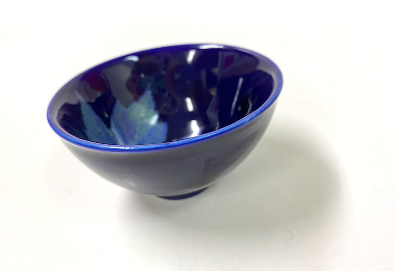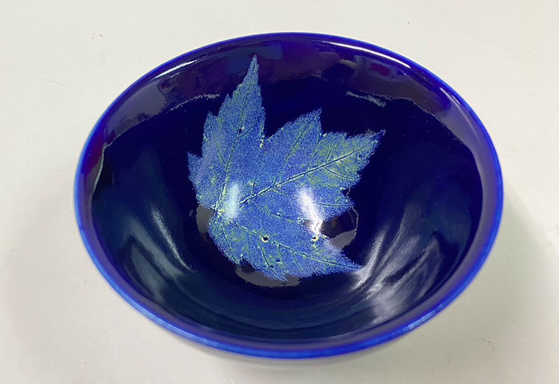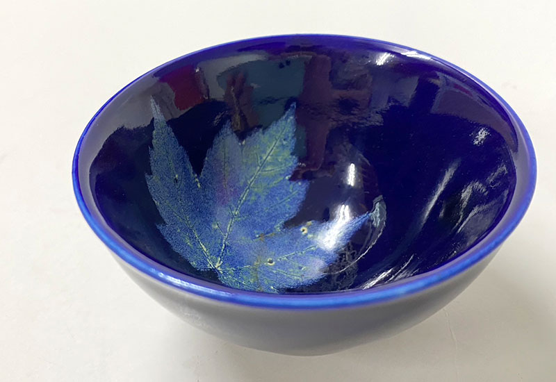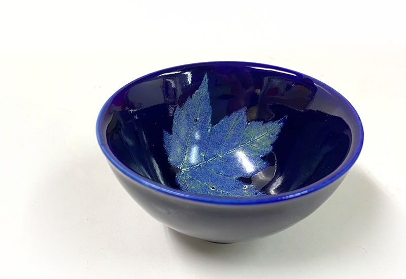 晶瑩剔透的寶石藍、自然釉器物面貼上真實樹葉,以木葉裝飾,葉脈清晰惟妙惟肖,極富禪意。