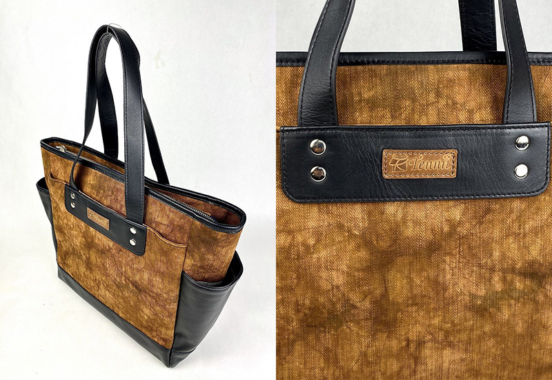 「寬容」的袋身為雲染厚棉布所製作,之一是藍靛雲染的效果,之二是石榴皮染液疊染生柿汁產生的黃褐色效果,兩者都呈現很豐富的色彩層次,像似結晶釉般的絞染效果。
