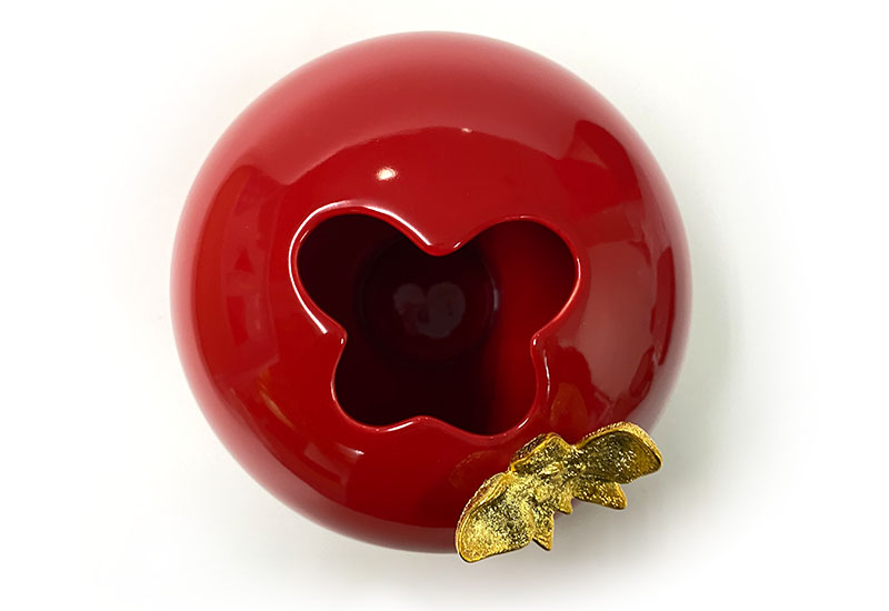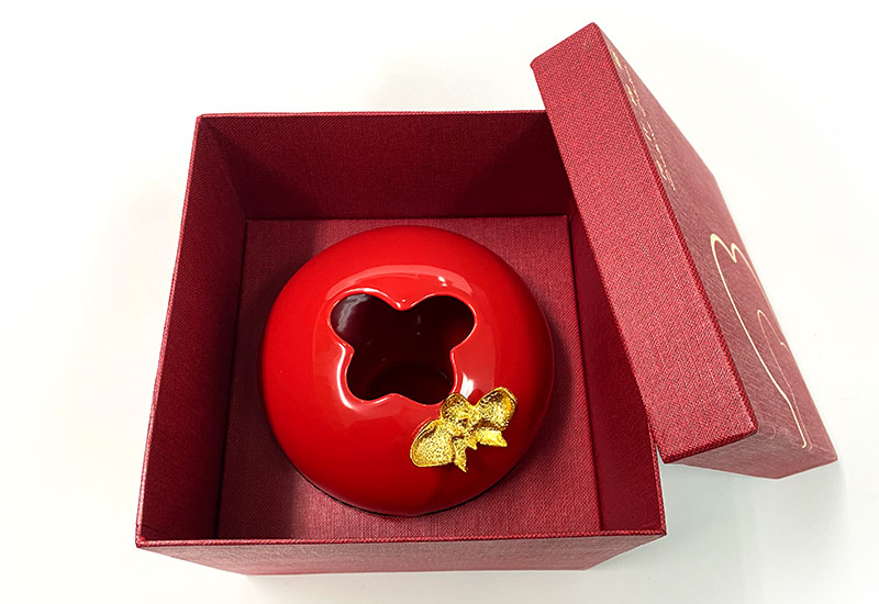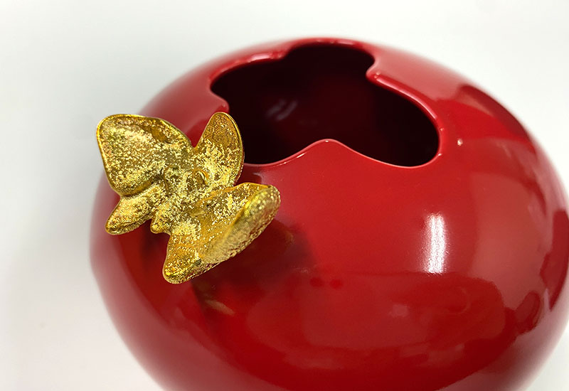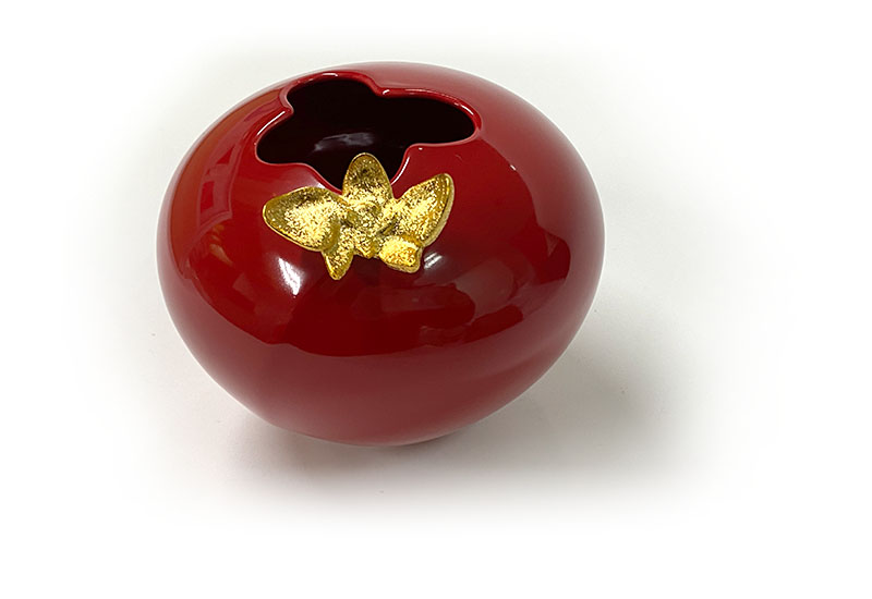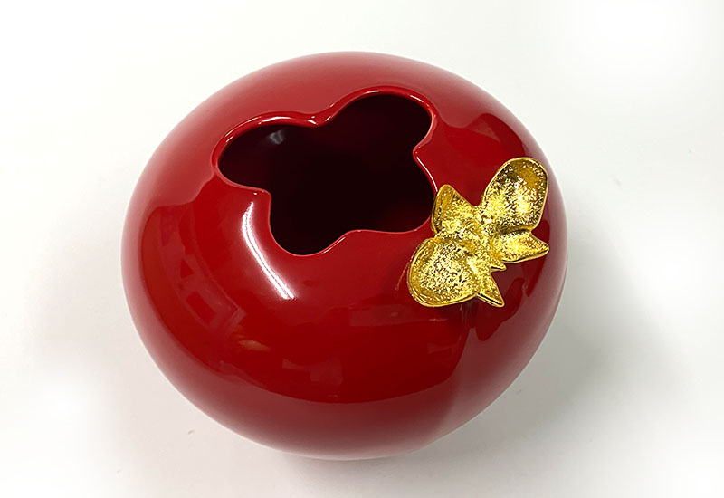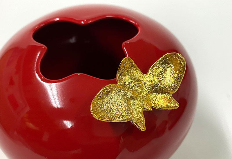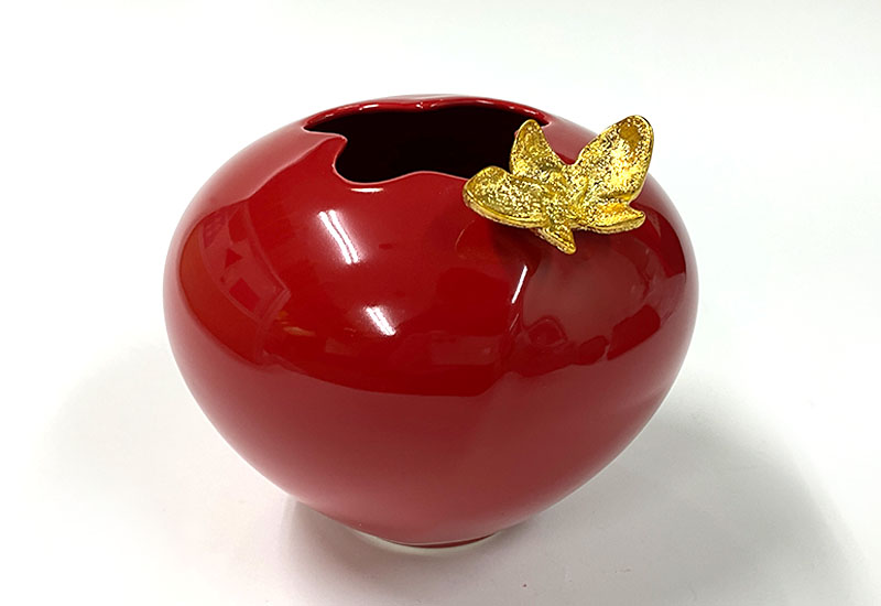 以花苞為器型,通體上紅色釉燒成,取其紅包的吉祥意義。再飾以盛開的蘭花,祝福來年從含苞走向盛開綻放!