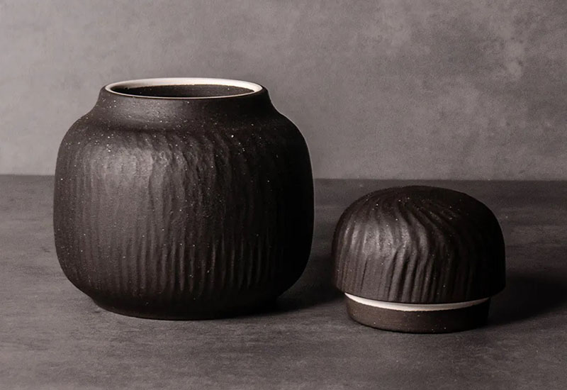 工藝與設計的靈魂透過手工鑄成器物的形體,器物的留白使『用者』留下歲月的痕跡、能為器物活出獨有性格。因此設計上採用純粹、不多餘的黑白兩色呼應,原礦黑泥加上定白釉,並以1250度高溫燒製。