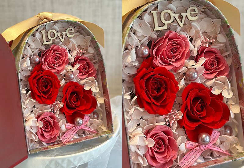 濃烈深紅永生玫瑰為主角,象徵熱戀愛意,搭配粉嫩永生玫瑰及永生白繡球花,營造出浪漫與典雅.
