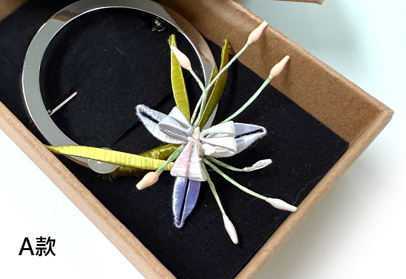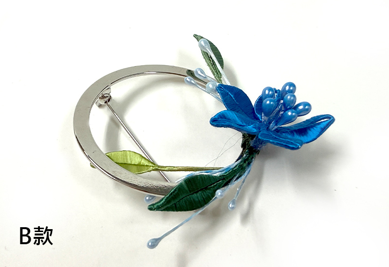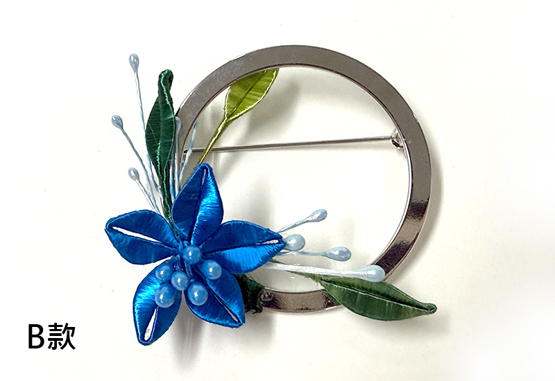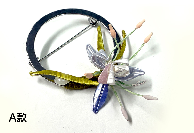 圓潤的金屬環象徵著滿月,承載人們對團圓與圓滿的期盼。纏花工藝以絲線層層纏繞,幻化成盛放的花卉,紅與紫交映,如同花團錦簇的佳節時光。花語傳遞吉慶與喜悅,月色寄寓團圓與美滿,將「花好月圓」的祝福凝結於胸前一隅。此件作品不僅是飾品,更是一份祈願,願佩戴者的生命如花綻放,如月圓滿。