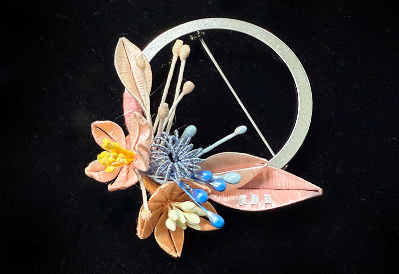 圓潤的金屬環象徵著滿月,承載人們對團圓與圓滿的期盼。纏花工藝以絲線層層纏繞,幻化成盛放的花卉,紅與紫交映,如同花團錦簇的佳節時光。花語傳遞吉慶與喜悅,月色寄寓團圓與美滿,將「花好月圓」的祝福凝結於胸前一隅。此件作品不僅是飾品,更是一份祈願,願佩戴者的生命如花綻放,如月圓滿。