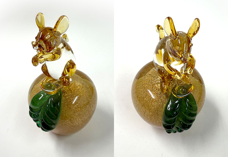 以傳統坩堝窯爐手工熱塑打造的十二生肖系列,每件皆立於銀箔烤金蘋果之上,象徵平安、富貴與好運相隨。玻璃質地透亮、金箔光澤華麗,是兼具寓意與美感的收藏精品。