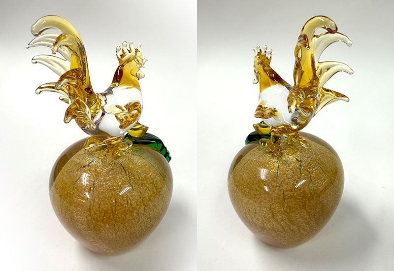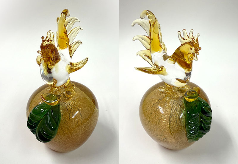 以傳統坩堝窯爐手工熱塑打造的十二生肖系列,每件皆立於銀箔烤金蘋果之上,象徵平安、富貴與好運相隨。玻璃質地透亮、金箔光澤華麗,是兼具寓意與美感的收藏精品。