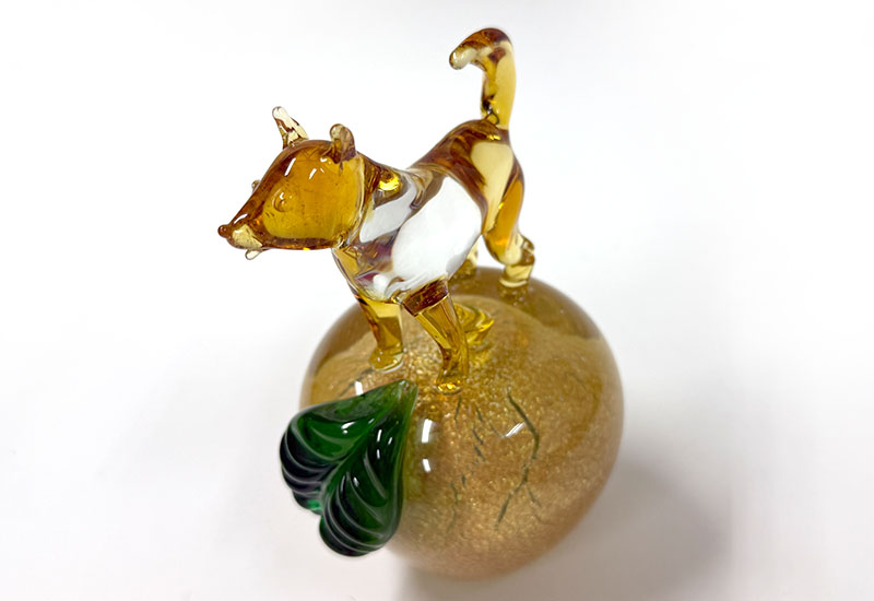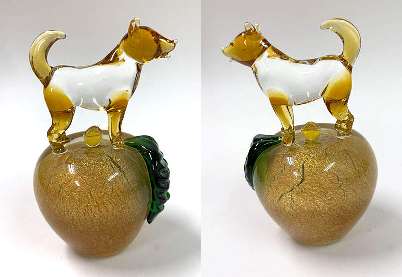 以傳統坩堝窯爐手工熱塑打造的十二生肖系列,每件皆立於銀箔烤金蘋果之上,象徵平安、富貴與好運相隨。玻璃質地透亮、金箔光澤華麗,是兼具寓意與美感的收藏精品。