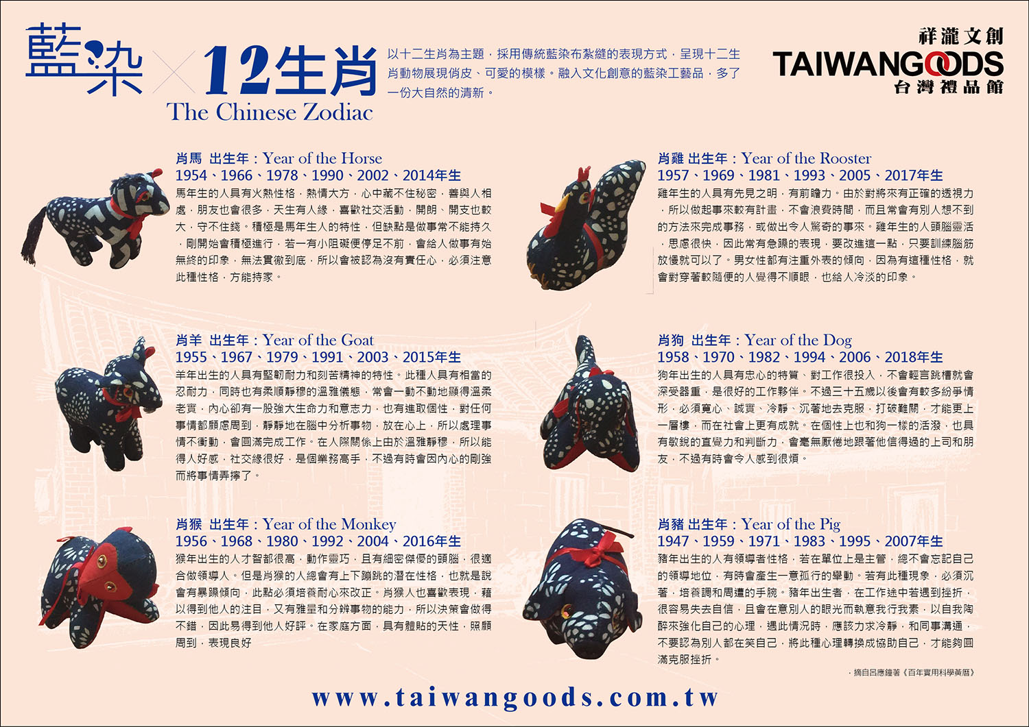 以十二生肖為主題,採用傳統藍染布紮縫的表現方式,呈現十二生肖動物展現俏皮、可愛的模樣。融入文化創意的藍染工藝品,多了一份大自然的清新。